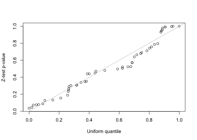 qqplot(runif(length(p)), p, xlab = "Uniform quantile", ylab = "Z-test p-value")