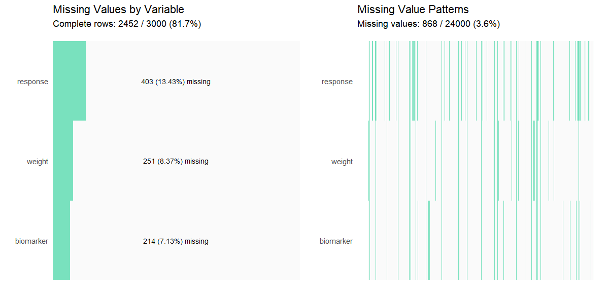 Numeric parameter indicating the proportion (0-1) of missing values to be introduced across numeric variables with fixed proportions (biomarker = 15%, weight = 25%, response = 60%). | 0 |