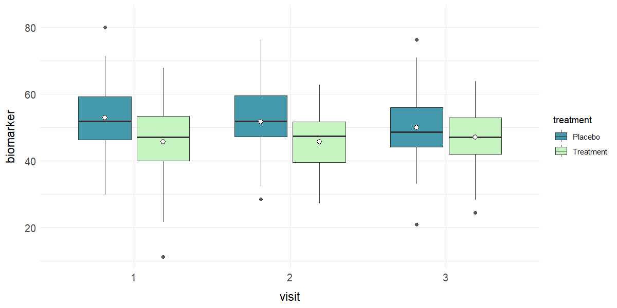# Boxplot of biomarker by study visit and treatment