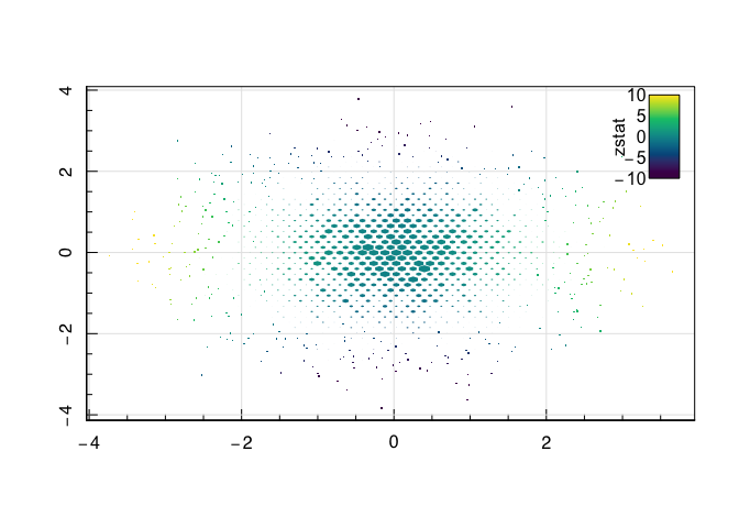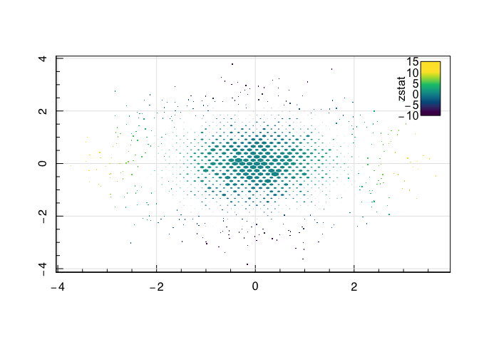 magbin(xydata, z=xydata[,1]^2-xydata[,2]^2, colref='zstat', sizeref='count')